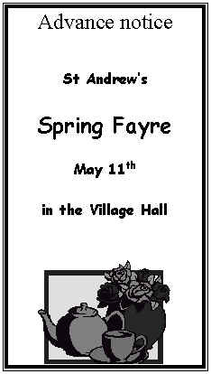Thank you to everyone who came to our first Spring Fayre. £580 was raised for Church funds. It was good to see the church so full of people having fun relaxing over afternoon tea and picking up a bargain too! Don't forget to come along to our Good as New Sale on Saturday 27th April at 2.30p.m. Once again the tea room will be open with home made cakes and preserves for sale.