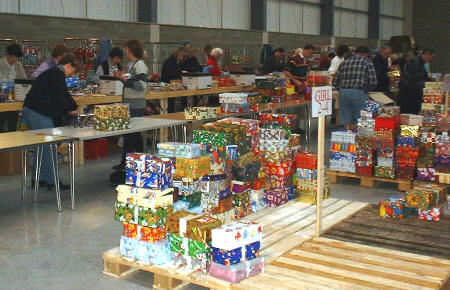 We had been invited to visit the warehouse at Chelmsford and to meet up with Sheila Heaton, the area organiser for this area who came to St Andrew's in February to talk to us about the good work Samaritans Purse do, and what happens to all the shoe-boxes when they leave the United Kingdom. On November 13th Tony in his van full of cartons bound for Chelmsford and Teresa, Brenda McMichael, Gill Downs and myself (Sue Cowell) set off. We had a long tiring journey due to hold-ups and traffic jams but finally arrived at the enormous warehouse that the organisation has been given rent-free until the middle of December. We met with Sheila who introduced us to her warehouse manager Bob Hardy, who has been helping with his wife for the last six years and he arranged to show us around the huge operation. They have about 50 volunteers who all work different shifts, checking and packing all the boxes that arrive. There is a line of tables complete with fillers that have been donated, for boxes that do not have much in, then a line of ladies checking there for liquids or dangerous articles in the boxes and who remove the £2 postage. The boxes are passed to the next row for sealing and put on the correct pallet for that age group and finally an experienced packer puts about 16/17 boxes into a large carton which is sealed ready for its long trip abroad. There is a special corner for Colin Ridgewell, the joint area organiser who sends out donations of clothes, shoes and large cuddly toys along with the shoe-boxes. We were amazed at the scale of the operation but it was extremely rewarding and who knows - next year, Teresa and Tony could be on the look-out for much larger premises for this area, so if you do hear of any vacant premises that might be suitable please bear it in mind. Trucks have already left Chelmsford bound for Romania and Odessa, in the Ukraine with some of our boxes, and on 6th December there is a truck bound for Russia, which will include more from this area.