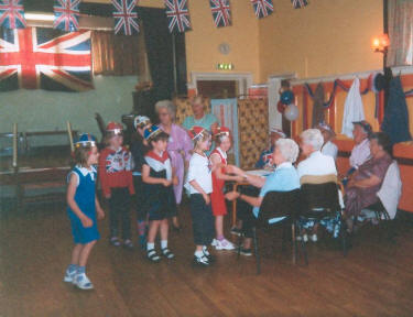 What a really lovely afternoon we all had with the brownies & their leaders. We were joined by Shirley Bassey (Gill) and the Beverly Sisters (Barbara, Shirley & Sandra) they were really fantastic, then a very enjoyable tea & Jubilee Cake made by Sandra, the Union Jack on the top was perfect, as was the cake. The Brownies entertained us with their songs & Michael joined in singing Hands & Friends & Neighbours, then the girls & their leaders all came round and shook everyones hands, as I said before a really good afternoon and a credit to this lovely Village.