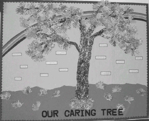 Our picture this month is the 'Caring Tree' which is on display in the school hall. Every child in the school made an imprint of their hands. These were cut out and used to make the foliage and leaves. So every member of the school is represented in the display. The rainbow represents the promises that were made to care for each other. The words on the picture are all 'caring' words.