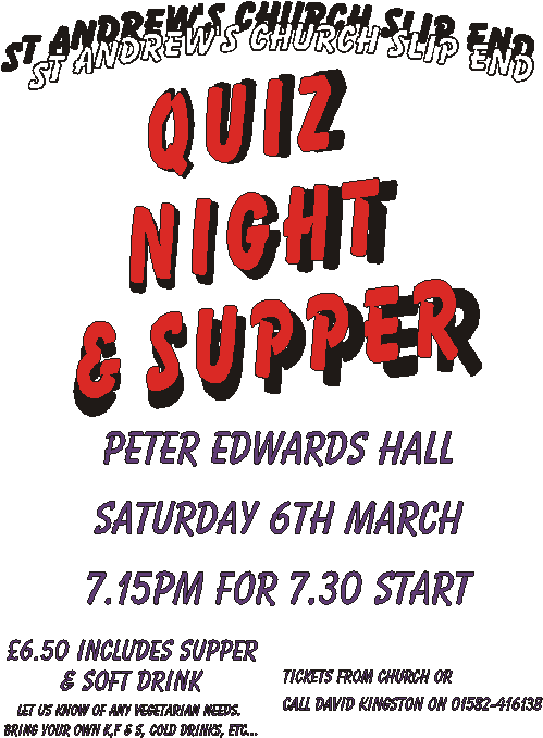 Tickets are now available at just £6.50 per person (including supper) from David Kingston 01582 416138 or davidgoodmankingston@hotmail.com. Bring your own cutlery, glasses and cold drinks, we’ll provide tea and coffee. Come as a team (maximum 8 persons) or as an individual and join a team on the night. All welcome!